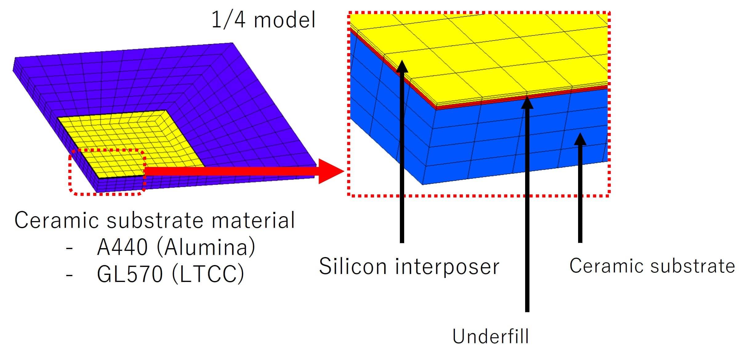 We conducted a simulation to verify compatibility with Si using Kyocera's most widely adopted material, A440 (alumina), and GL570 (LTCC), which was developed to provide CTE closer to that of Si.
