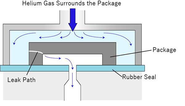 A test to confirm the hermeticity of a package, performed using a helium detector. When testing a package individually, the cavity is inverted on a rubber seal; then, a vacuum pump lowers the pressure inside the package, and helium gas is applied outside the package. If any leak path exists, the helium will be detected, indicating a hermetic failure.