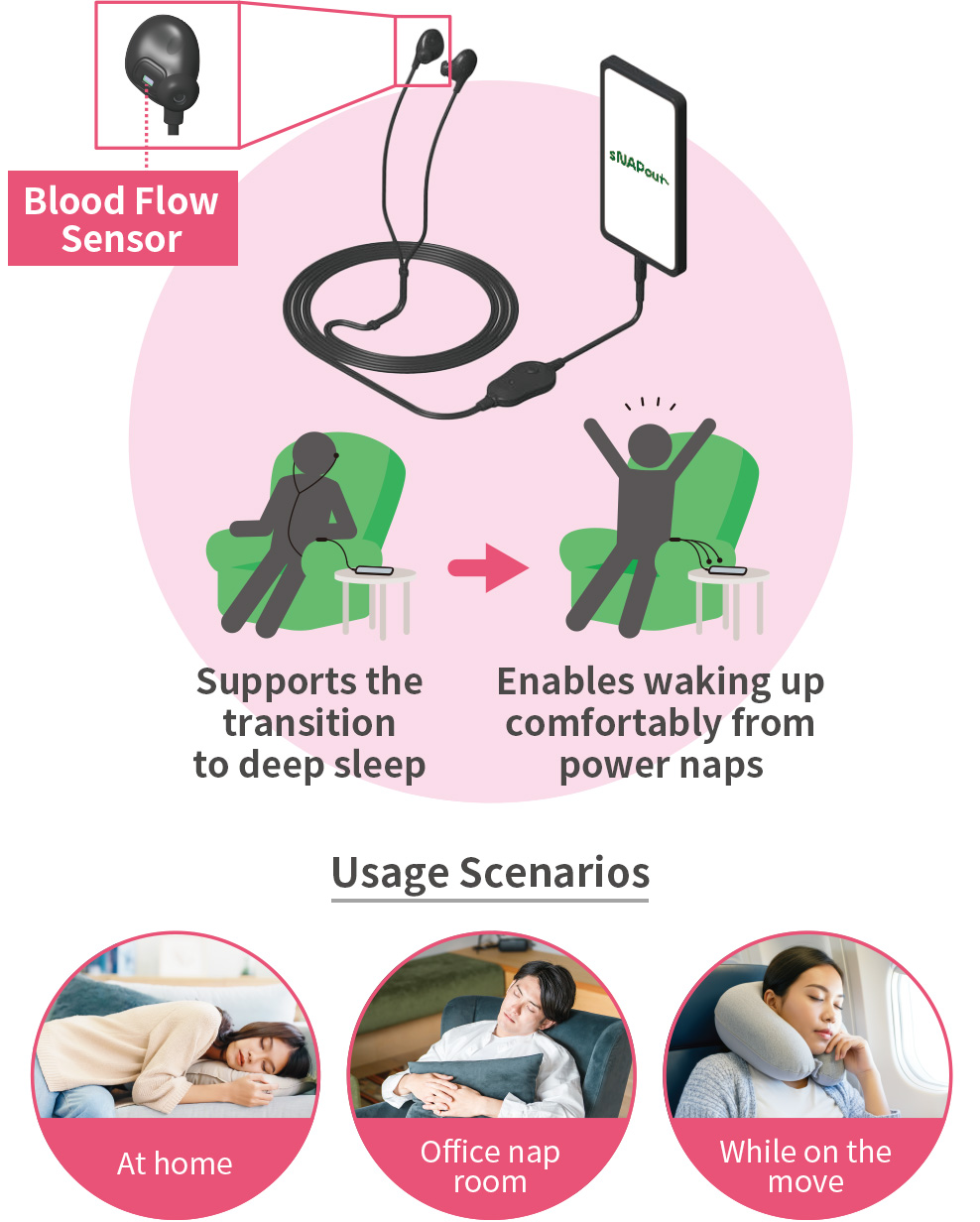 This earphones device, equipped with Kyocera's unique Laser Doppler blood flow sensor, measures blood flow in the ears in real time. The acquired data is then used by AI to analyze the state of your sleep. Based on the results of the analysis, an alarm sounds at the most optimal time according to your sleep cycle, ensuring you can wake up easily and comfortably after your nap. Additionally, by playing a combination of natural and sleep-inducing sounds of different frequencies in each ear, it enhances relaxation while aiding a quick transition to a natural nap. It assists with having adequate naps and waking up easily, helping to eliminate daytime drowsiness and improve productivity for workers. *"sNAPout" is a registered trademark of KYOCERA Corporation in Japan. *Product images are for illustrative purposes only.